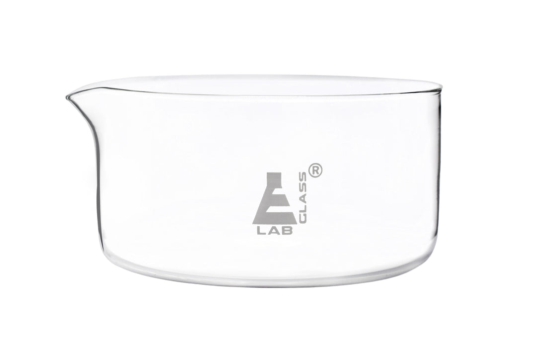 Dish Crystallizing, outer dia 150mm, borosilicate glass, flat bottom with spout, Each