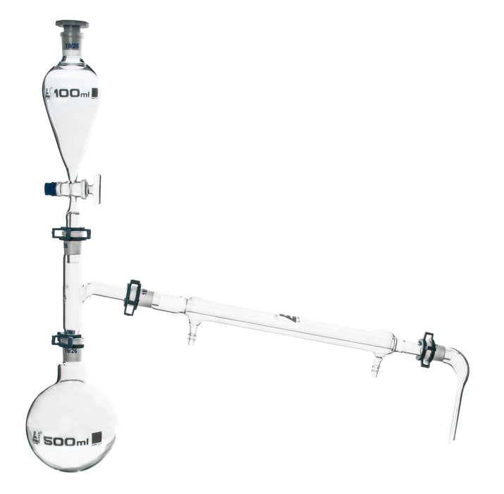 This distilling kit is made of high-quality borosilicate glass. The kit consists only of the glassware for distilling experiments and does not include tubing, a heat source, or stands. All joint sizes are 19/26. Everything in the picture is included. This kit comprises the following components: Round-bottom Boiling Flask (500 ml), Still head, Liebig Condenser, Receiver adapter, and Separating funnel with stopper. Note that this kit does not come with a glass beaker or metal stands.