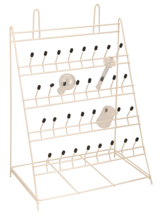 Eisco's draining rack is perfect for the lab, yet attractive enough for the kitchen. It's vinyl coated metal build is easy on glassware while being durable at the same time. Pegs are spaced 2.25" apart horizontally and 6"/5.5"/6.5" vertically to hold a variety of shapes and sizes; test tubes, beakers, coffee mugs, etc.