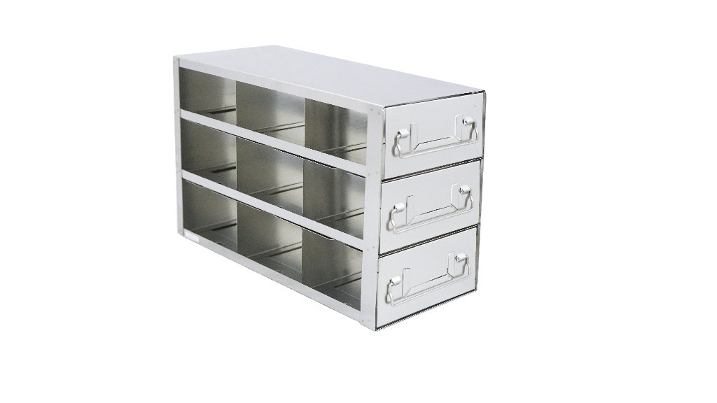 Our upright freezer drawer racks are designed to hold 3" boxes and are made with the highest levels of quality using pharmaceutical grade stainless steel, double welds, smoothed edges, and come with an unconditional lifetime warranty.