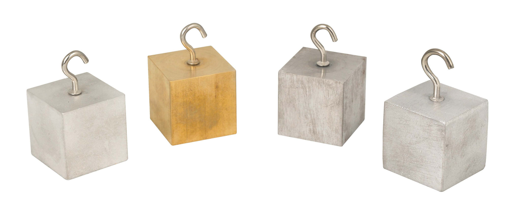 This versatile set is ideal for studying density and specific heat. A block each of brass, lead, aluminum, and steel are included in the kit, along with a complete instruction manual that provides background information on density, specific gravity, and specific heat, and contains three student activities with data sheets and a lab practical quiz. Each mass is 32mm cubed. The hook on top of each cube makes it easy to measure mass using a spring scale, and also facilitates adding and removing masses from boiling water for specific heat experiments.