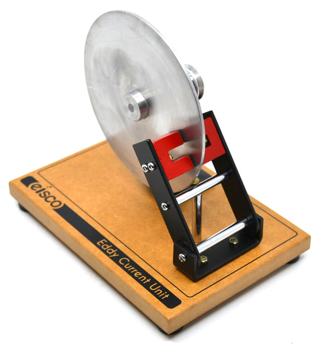 This Malvern Eddy Current Unit is designed for demonstrating eddy current braking when used in conjunction with a hand wheel driving unit. The aluminum disc has a diameter of 4.5 inches and features a 20mm driving pulley. Powerful circular magnets are mounted on a pivoted arm, allowing them to be moved over or away from the disc as required. The apparatus is securely mounted on a wooden base, which has rubber stoppers underneath to prevent it from moving or sliding on the surface during use. The unit stands 6.5 inches tall, 7 inches long, and 4.6 inches wide.
