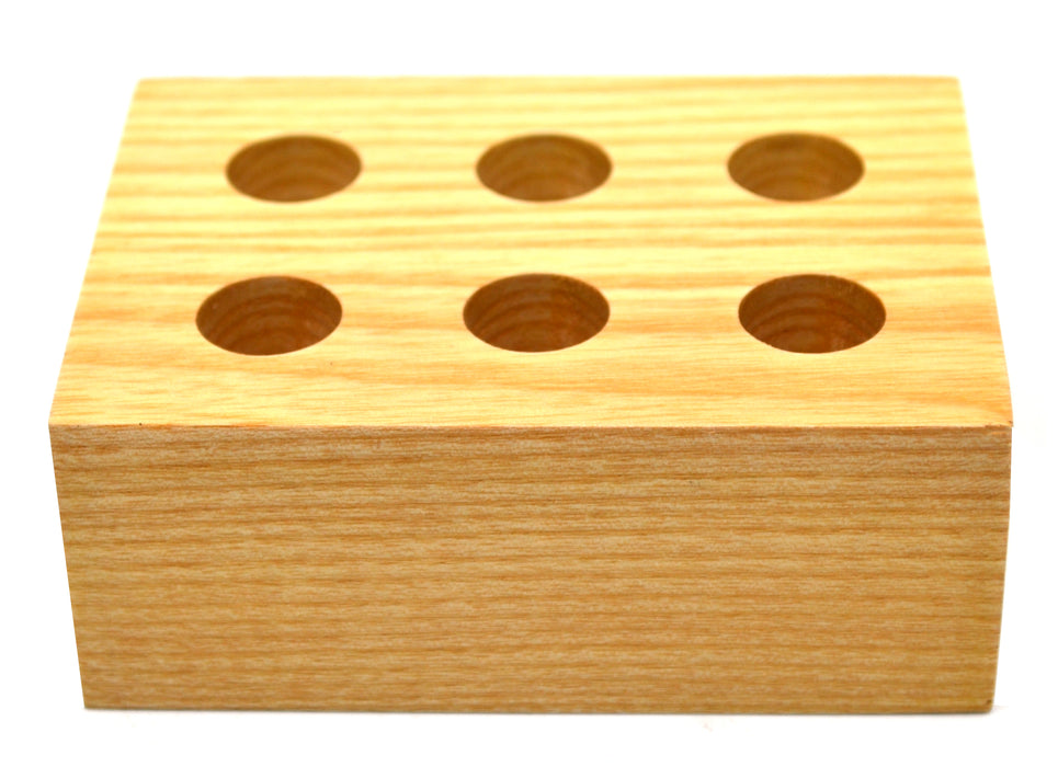 This wooden storage block is the perfect size for any home or lab setting. Each storage block is approximately 4" long, 3" wide, and 1.5" tall. Contains 6 holes to store entomology pins of various lengths and sizes. Each hole has a diameter of 3/8" and a depth of 1".