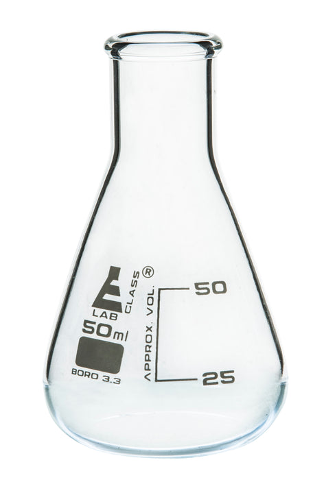 Here is the corrected text: This single Erlenmeyer flask features a 50mL capacity and easy-to-read white enamel graduations every 25mL. Made of high-quality, heavy-duty borosilicate 3.3 glass, it offers excellent strength against breakage and superior chemical durability. The flask is microwavable and autoclavable, withstanding high temperatures and thermal shocks. Its uniform wall thickness makes it ideal for heating, while the reinforced rim provides protection against high impacts. Conforming to DIN ISO 1773 standards for narrow-neck conical flasks, this product boasts superior chemical durability and heat tolerance. Designed for use in professional laboratories, it is also an excellent choice for science classrooms and household use. The borosilicate glass has a low temperature gradient and can withstand high temperatures and thermal shocks, with the following heat tolerances: strain point 515°C, annealing point 565°C, and softening point 820°C.