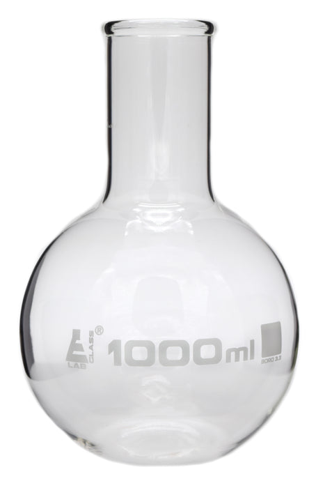 Here is the corrected text: Made of high-quality, heavy-duty borosilicate glass, this 1000ml capacity Florence boiling flask features a wide neck, flat bottom, and beaded rim. It measures 7.5 inches tall, with a 5.25-inch bottom diameter, 3-inch neck length, and 1.75-inch neck diameter. Perfect for any science or home laboratory, it does not include a stopper. Eisco Labs borosilicate glass has the following heat tolerances: strain point -515°C, annealing point 565°C, and softening point 820°C.