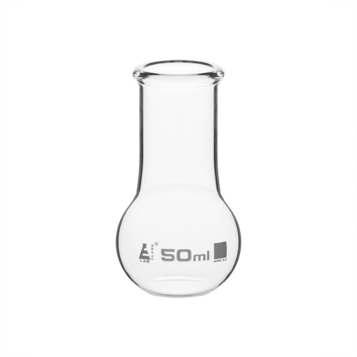 This 50ml borosilicate glass boiling flask features a flat bottom and wide neck, conforming to the DIN ISO 24450 standard. It measures 52mm in width and 100mm in height, with an internal opening diameter of 29mm and a bead of 4mm. Autoclavable and boasting superior chemical durability, this flask exhibits a low temperature gradient, allowing it to withstand high temperatures and thermal shocks. The borosilicate glass used by Eisco Labs has the following heat tolerances: strain point -515°C, annealing point 565°C, and softening point 820°C. Eisco Labs manufactures its products using state-of-the-art equipment and adheres to the highest standards of quality control. A team of laboratory professionals and experienced engineers carefully designs each product with quality and durability in mind, using only the highest-grade raw materials and international quality standards to ensure they can withstand even the toughest laboratory environments.