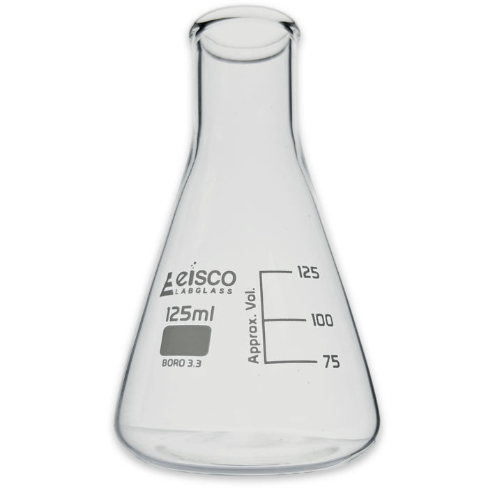 The Eisco Labs 125mL Conical Flask, made from borosilicate glass, is designed for use in chemistry, biology, and environmental science labs. Its narrow neck minimizes evaporation, while its conical shape allows for easy mixing of solutions. Ideal for titrations, microbial culture growth, and chemical reactions. Resistant to high temperatures, this flask is suitable for direct heating. Perfect for scientists, researchers, and students conducting a range of laboratory experiments. 23mm innder diameter28mm outer diameter2.75" wide4.5" height