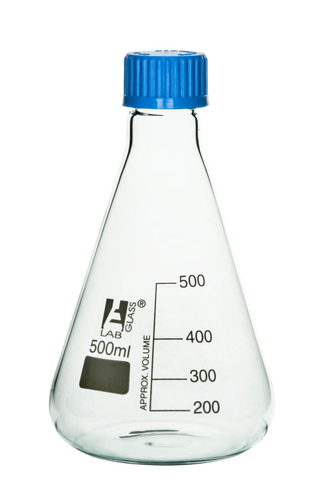 Made of high-quality borosilicate glass, this conical flask features a design that prevents spills and is equipped with a screw cap lined with Teflon. With a capacity of 500ml, the flask has white graduation lines marked every 100ml. Perfect for use in any science or home laboratory, this Erlenmeyer conical flask measures 7 inches tall and 4 inches in diameter, with a neck diameter of 0.75 inches. The borosilicate glass used by Eisco Labs has the following heat tolerances: strain point, 515°C; annealing point, 565°C; and softening point, 820°C.