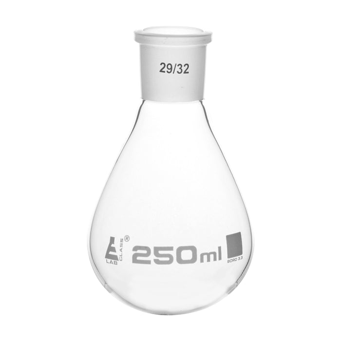 Evaporating Flask made of high quality, heavy duty, 3.3 borosilicate glass. 250ml capacity. Single interchangeable joint with socket size 29/32. Stands 5.5" tall, and is 3" in diameter at its widest point. Perfect for any home, school, or professional science laboratory.