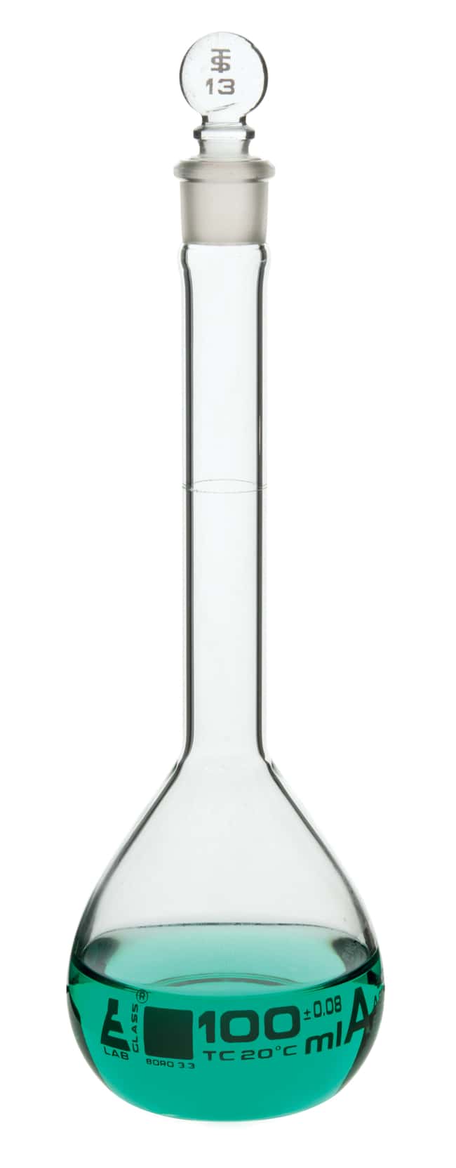 Eisco™ Class A Glass Volumetric Flasks with White Graduations feature a flat bottom design, interchangeable solid glass stoppers, and single graduation. Include solid glass stoppers Flat bottom design Single graduation mark White printed markings Class A, in compliance with ASTM-E288 Autoclavable