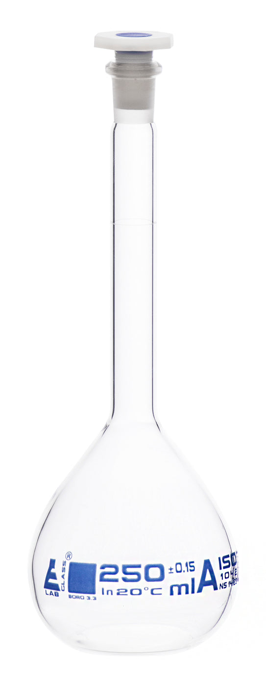 Flask, Volumetric 250ml, Class A with Stopper and Individual work certificate, Blue Line of Demarcation, Each