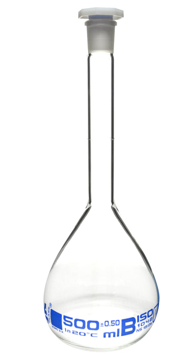 Volumetric flask made of high quality, heavy duty, 3.3 Borosilicate glass. Class B tolerance. 500ml capacity. Socket size 19/26. Fitted with chemical resistance polyethylene stopper. As per DIN ISO 1042 standard. Stands 12.5" tall with a 4" width at the widest point.
