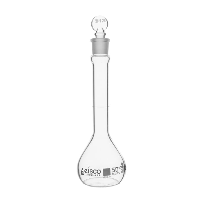 50ml capacity volumetric flask made of high quality, heavy duty 3.3 borosilicate glass. Single, white graduation mark. Class A, tolerance ±0.05 ml. Fitted with a solid glass, 13mm stopper. Flask stands 5.5" tall, and has a bottom diameter of 1.9". Eisco Labs Borosilicate glass has the following heat tolerances: Strain Point -515°C | Annealing Point 565°C | Softening Point 820°C