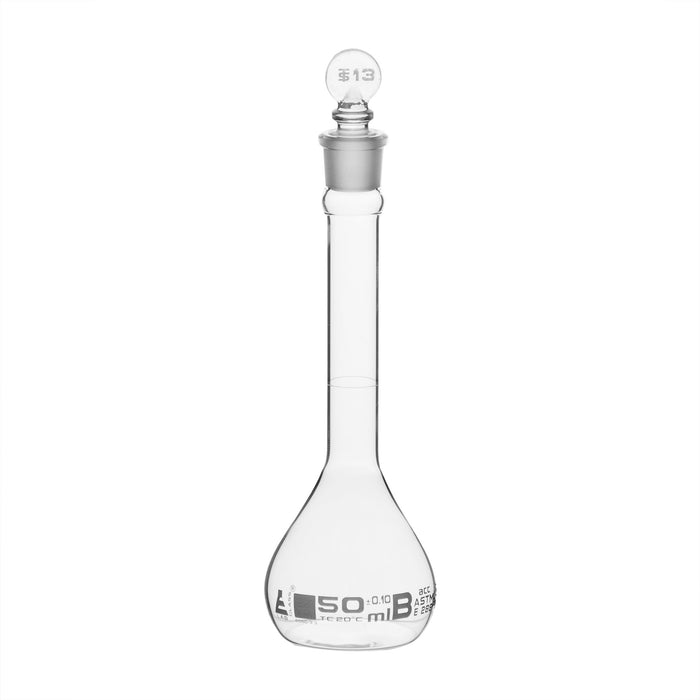 50ml capacity volumetric flask made of high quality, heavy duty 3.3 borosilicate glass. Single, white graduation mark. Class B, tolerance ±0.10 ml. Fitted with a solid glass, 13mm stopper. Flask stands 5.5" tall, and has a bottom diameter of 1.9". Eisco Labs Borosilicate glass has the following heat tolerances: Strain Point -515°C | Annealing Point 565°C | Softening Point 820°C