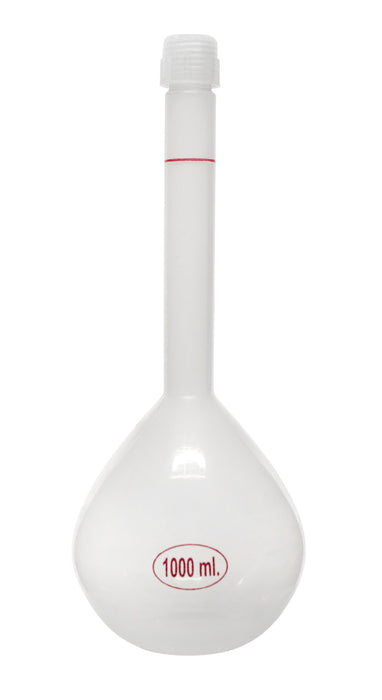 Volumetric flask with a 1000ml capacity. Single graduation line. Flask is blown in high quality, heavy duty polypropylene plastic. Microwavable and resistant to fatigue for long term durability. High heat tolerance with a temperature range of -20 to 135°C. Good to excellent chemical resistance. Autoclavable at 121°C for easy cleaning and sterilization. Good contact clarity. Fitted with screw cap to prevent leakage. Designed for use in professional laboratories, but is an ideal choice for science classrooms and household use. Flask stands 13" tall and is 4.5" in diameter at its widest point. Neck has an outer diameter measuring 1".