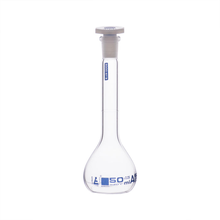 50ml capacity volumetric flask made of high-quality, heavy-duty Borosilicate 3.3 glass with a single graduation mark. It is fitted with a chemical- and heat-resistant 12/21 polypropylene cap. This Class A flask has a tolerance of ±0.05ml and is calibrated to contain. The flask stands 5.75" tall, with a bottom diameter of 1.9" and a neck diameter of 0.6". It is autoclavable, offering superior chemical durability and a low temperature gradient, allowing it to withstand high temperatures and thermal shocks. Eisco Labs Borosilicate glass has the following heat tolerances: strain point -515°C, annealing point 565°C, and softening point 820°C.