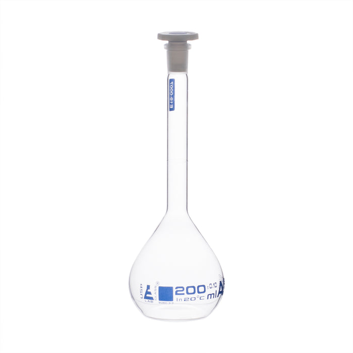 Volumetric flask made of Borosilicate 3.3 glass with single graduation mark. Fitted with chemical resistant polypropylene stopper. Class A tolerance. Compliant with ASTM-E288 standards.Capacity: 200ml