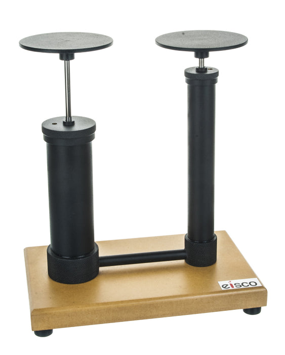 This fluid pressure apparatus is ideal for demonstrating the transmissibility of fluid pressure. It features two brass cylinders (19mm and 38mm in diameter) fitted with pistons and connected by a brass tube. The pistons are equipped with circular discs for loading masses (masses not included). The apparatus is securely fixed to a sturdy, molded plastic base with rubber stoppers underneath, preventing it from sliding or moving during use. The apparatus measures approximately 8 inches long, 5 inches wide, and 9 inches tall, and weighs 2.9 pounds.