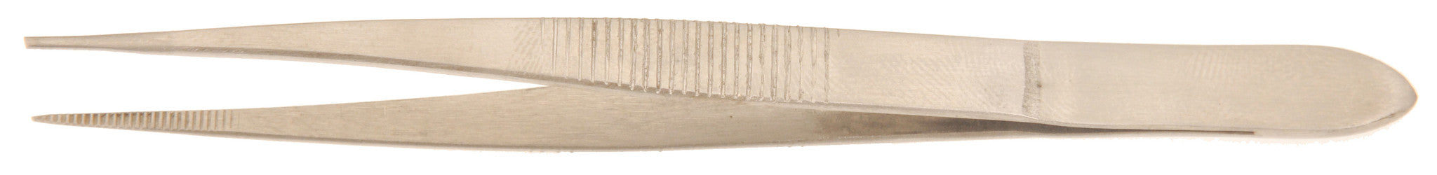 This stainless steel instrument features very fine, straight ends. Its overall length is 105 mm.