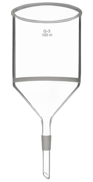 Buchner funnel is made of high-quality, heavy-duty 3.3 borosilicate glass and has a capacity of 1000ml. The funnel features a sintered disc with G-3 porosity and a jointed stem with a 19/26 cone size. It measures 12.5 inches in total height. The inner diameter of the body measures 4.85 inches (123mm), and the outer diameter measures 5.3 inches (134mm). The stem measures 4.3 inches in length, with an inner diameter of 10mm and an outer diameter of 13mm at the stem end. Eisco Labs' borosilicate glass has the following heat tolerances: strain point -515°C, annealing point 565°C, and softening point 820°C.