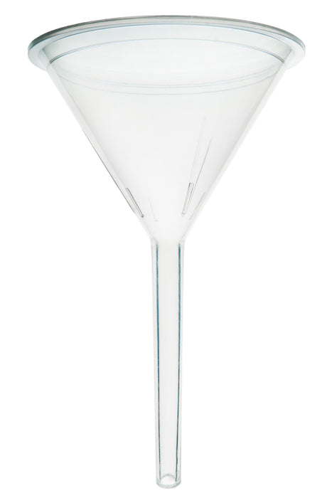 Industrial-quality filter funnels made of polypropylene plastic excel at separating solids from liquids and facilitating easy transfers of liquids to narrow-mouthed containers. The funnel measures 4.6 inches in total length and 2.6 inches in diameter, with a stem that is 2.5 inches long and has an outer diameter of 6.5mm. Designed for professional laboratory use, it is also an ideal choice for science classrooms and household applications. Eisco Labs proudly manufactures its own products using state-of-the-art equipment and adhering to the highest standards of quality control. Each product is carefully designed by a team of laboratory professionals and experienced engineers with quality and durability in mind. They are manufactured using only the highest-grade raw materials, according to international quality standards, ensuring they can withstand use in even the toughest laboratory environments.