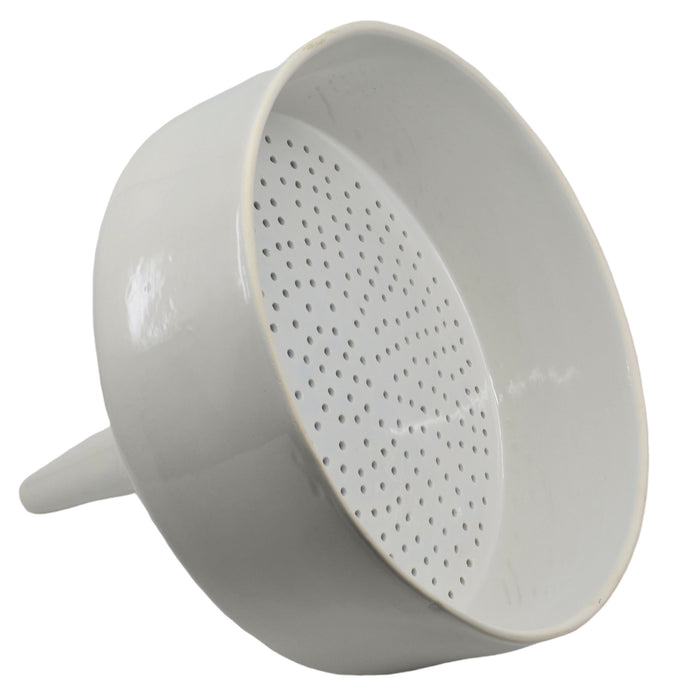 This 30cm Büchner funnel features straight sides and a fixed perforated plate made of glazed porcelain. It is designed for filtration, which involves separating solid matter from fluid. Note that filtration paper is required but not included; it is recommended to use 28.5-29cm filter paper. To prevent initial leakage, moisten the filter paper with a liquid before use. The funnel measures 14 inches tall and 11.8 inches wide, with an inner diameter of 11 inches and a 4.8-inch long spout. The spout's inner diameter is 20mm, and its outer diameter tapers from 50mm to 30mm. This Büchner funnel is often used in combination with a Büchner flask, Büchner ring, and sinter seals. Eisco Labs proudly manufactures its products using state-of-the-art equipment and adheres to the highest standards of quality control. Each product is carefully designed by a team of laboratory professionals and experienced engineers with quality and durability in mind. Only the highest-grade raw materials are used in manufacturing, following international quality standards to ensure that our products can withstand use in even the toughest laboratory environments.