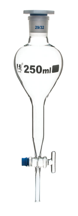Here is the corrected text: Gilson-style separating funnels are made of high-quality, heavy-duty borosilicate glass and have a 250ml capacity. They feature a glass stopcock and a 29/32 size socket with an interchangeable plastic stopper. The funnel measures 13.75 inches tall, with a body diameter of 3.25 inches. The stem is 2.5 inches in length, with an inner diameter of 7mm and an outer diameter of 10mm. Eisco Labs' borosilicate glass has the following heat tolerances: strain point -515°C, annealing point 565°C, and softening point 820°C. Perfect for any science or home laboratory.