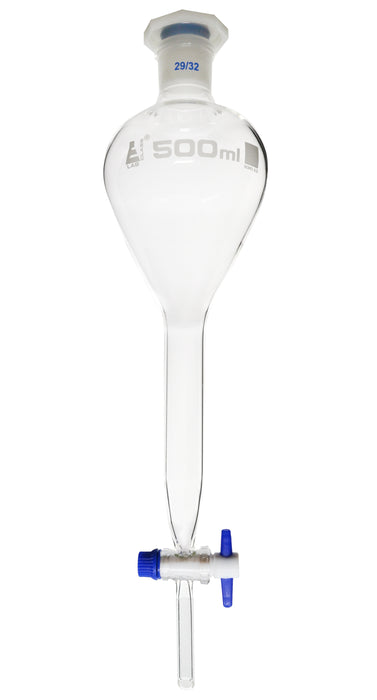 Gilson-style separating funnels are made of high-quality, heavy-duty borosilicate glass and have a 500ml capacity. The socket size is 29/32, and the interchangeable PTFE key stopcock ensures easy operation. Measuring 15.5 inches long and 4 inches wide at its widest point, this separating funnel is a reliable choice for laboratory applications.