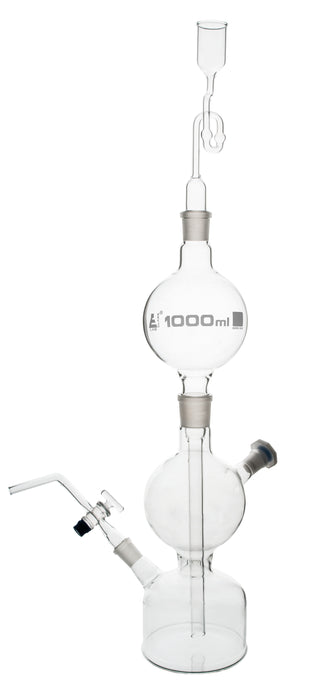 Here is the corrected text: Kipp's Gas Generator is made of high-quality, heavy-duty 3.3 Borosilicate glass. It has a volume of 1000mL and comprises three chambers: a lower acid reservoir with a stopper, a central bulb with a tapered tube extending downwards into the reservoir, and a safety funnel. This generator can be used to produce controllable amounts of common gases, including hydrogen sulfide, carbon dioxide, and other gases. It is perfect for any home, school, or professional laboratory.