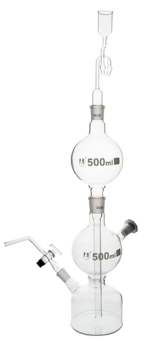 Here is the corrected text: The Kipp's Gas Generator is made of high-quality, heavy-duty 3.3 Borosilicate glass and has a 500ml volume. It consists of three chambers: a lower acid reservoir with a stopper, a central bulb with a tapered tube extending downwards into the reservoir, and a safety funnel. This generator can be used to produce controllable amounts of common gases, including hydrogen sulfide, carbon dioxide, and other gases. It is perfect for any home, school, or professional laboratory. The separator prevents the solid reactant in the central bulb from falling into the reservoir. Closing the stopcock builds up gas pressure in the central bulb and forces the acid away from the solid reactant, thereby halting the reaction. Opening the stopcock allows the acid to return to its original level, and the reaction continues as before. Eisco Labs proudly manufactures its own products using state-of-the-art equipment and follows the highest standards of quality control. Each product is carefully designed by a team of laboratory professionals and experienced engineers with quality and durability in mind. They are manufactured with only the highest-grade raw materials and according to international quality standards to ensure that they can withstand use in even the toughest laboratory environments.