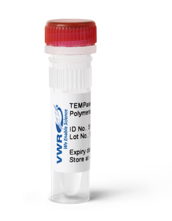 Concentration: 5 U/µl, TEMPase Hot Start DNA Polymerase is a chemically modified version of VWR® Taq DNA Polymerase and is activated by 15 minutes of heat treatment., TEMPase Hot Start DNA Polymerase concentration | : 5 Units/μl TEMPase Hot Start DNA Polymerase is suitable for detection of low abundance targets, screening, multiplexing, direct colony PCR and real-time PCR applications TEMPase Hot Start DNA Polymerase has been designed to diminish the formation of non-specific priming events during reaction set-up and the first ramp of thermal cycling. Chemical inactivation of TEMPase Hot Start DNA Polymerase has proven highly effective compared to other inactivation methods such as antibody inactivation. The chemically modified enzyme withstands longer periods of time at room temperature without non-specific PCR amplifications. This feature is useful if you need pre-incubation at elevated temperatures, for example in case of UNG treatment at 50 °C prior to PCR. TEMPase Hot Start DNA polymerase is also available in a glycerol-free format for automation and lyophilization. Long term storage at -20 °C. Product expiry at -20 °C is stated on the label. Optional: Store at 4 °C for up to 6 months. TEMPase Hot Start DNA Polymerase is usually supplied in kits with Key Buffer and Combination Buffer. 10X Key Buffer promotes high specificity over a broad range of annealing temperatures and Mg2 concentrations. The Key Buffer also works well when dealing with difficult templates, e.g. GC-rich DNA sequences. 10X Combination Buffer is a balanced ammonium-potassium PCR buffer. Combination Buffer results in tolerance towards optimization of primer annealing temperatures and Mg2 concentrations. Additional MgCl₂ is included with each kit to enable optimization., 02_BulletPoint: Reaction set-up at room temperature | dUTP incorporation possible | Increased sensitivity, specificity and product yield | Detection of low abundance targets | Processes up to 4 kb, 13_Caution: For Research Use Only. Not for use in diagnostic procedures., Tempase Hot Start DNA Polymerase with 10X Key Buffer and 10X Combination Buffer, Size: 500 units, Cat. No.: 76620-494, Units: EA, Concentration: 5 U/µl, TEMPase Hot Start DNA Polymerase is a chemically modified version of VWR® Taq DNA Polymerase and is activated by 15 minutes of heat treatment., TEMPase Hot Start DNA Polymerase concentration | : 5 Units/μl TEMPase Hot Start DNA Polymerase is suitable for detection of low abundance targets, screening, multiplexing, direct colony PCR and real-time PCR applications TEMPase Hot Start DNA Polymerase has been designed to diminish the formation of non-specific priming events during reaction set-up and the first ramp of thermal cycling. Chemical inactivation of TEMPase Hot Start DNA Polymerase has proven highly effective compared to other inactivation methods such as antibody inactivation. The chemically modified enzyme withstands longer periods of time at room temperature without non-specific PCR amplifications. This feature is useful if you need pre-incubation at elevated temperatures, for example in case of UNG treatment at 50 °C prior to PCR. TEMPase Hot Start DNA polymerase is also available in a glycerol-free format for automation and lyophilization. Long term storage at -20 °C. Product expiry at -20 °C is stated on the label. Optional: Store at 4 °C for up to 6 months. TEMPase Hot Start DNA Polymerase is usually supplied in kits with Key Buffer and Combination Buffer. 10X Key Buffer promotes high specificity over a broad range of annealing temperatures and Mg2 concentrations. The Key Buffer also works well when dealing with difficult templates, e.g. GC-rich DNA sequences. 10X Combination Buffer is a balanced ammonium-potassium PCR buffer. Combination Buffer results in tolerance towards optimization of primer annealing temperatures and Mg2 concentrations. Additional MgCl₂ is included with each kit to enable optimization., 02_BulletPoint: Reaction set-up at room temperature | dUTP incorporation possible | Increased sensitivity, specificity and product yield | Detection of low abundance targets | Processes up to 4 kb, 13_Caution: For Research Use Only. Not for use in diagnostic procedures., Tempase Hot Start DNA Polymerase with 10X Key Buffer and 10X Combination Buffer, Size: 10000 units, Cat. No.: 76620-498, Units: EA, Concentration: 5 U/µl, TEMPase Hot Start DNA Polymerase is a chemically modified version of VWR® Taq DNA Polymerase and is activated by 15 minutes of heat treatment., TEMPase Hot Start DNA Polymerase concentration | : 5 Units/μl TEMPase Hot Start DNA Polymerase is suitable for detection of low abundance targets, screening, multiplexing, direct colony PCR and real-time PCR applications TEMPase Hot Start DNA Polymerase has been designed to diminish the formation of non-specific priming events during reaction set-up and the first ramp of thermal cycling. Chemical inactivation of TEMPase Hot Start DNA Polymerase has proven highly effective compared to other inactivation methods such as antibody inactivation. The chemically modified enzyme withstands longer periods of time at room temperature without non-specific PCR amplifications. This feature is useful if you need pre-incubation at elevated temperatures, for example in case of UNG treatment at 50 °C prior to PCR. TEMPase Hot Start DNA polymerase is also available in a glycerol-free format for automation and lyophilization. Long term storage at -20 °C. Product expiry at -20 °C is stated on the label. Optional: Store at 4 °C for up to 6 months. TEMPase Hot Start DNA Polymerase is usually supplied in kits with Key Buffer and Combination Buffer. 10X Key Buffer promotes high specificity over a broad range of annealing temperatures and Mg2 concentrations. The Key Buffer also works well when dealing with difficult templates, e.g. GC-rich DNA sequences. 10X Combination Buffer is a balanced ammonium-potassium PCR buffer. Combination Buffer results in tolera