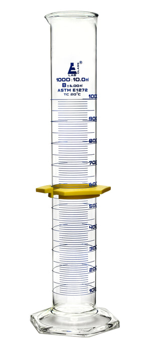 1000ml capacity measuring cylinder made of high quality, heavy duty Borosilicate 3.3 glass. Spout for easy pouring, and hexagonal base for extra stability. Class B tolerance, ±6.00ml as per ISO/ASTM. Fitted with a plastic, hexagonal protective collar.Cylinder stands 18" tall, with a base measuring 5" wide. Inner diameter of cylinder body measures 2.5", and outer diameter measures 2.8".Autoclavable, with superior chemical durability. Low temperature gradient- can withstand high temperatures & thermal shocks. Eisco Labs Borosilicate glass has the following heat tolerances: Strain Point -515°C | Annealing Point 565°C | Softening Point 820°C.