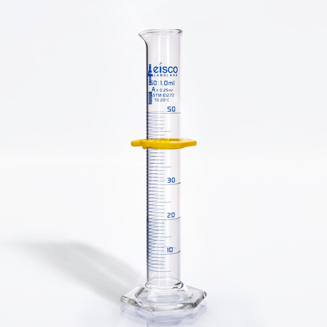 Here is the corrected text: Laboratory Glass Cylinder: A 50mL graduated cylinder made from 3.3 borosilicate Class A glass with TD (To Deliver) calibration for precise volume dispensing, including a hexagonal base and removable plastic guard. High-Contrast Graduations: The cylinder features blue printed major graduations every 10 mL and minor graduations every 1 mL, ensuring clear readability; the permanent scale supports consistent measurement routines. Stable Hexagonal Base: The wide hexagonal base provides added stability to reduce tipping during use, while the guard ring cushions impact when placed on hard surfaces or when knocked over. Suitable for Controlled Environments: This cylinder is designed for volume measurement in academic, research, and industrial laboratory applications where precision and traceability are essential. Class A Construction: The cylinder is manufactured to ASTM E1272 Class A tolerance standards with ±0.25mL accuracy; each unit is individually serialized with a printed scale for long-term identification and documentation.