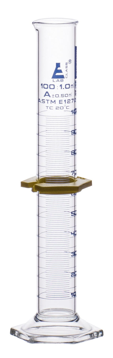 Graduated Cylinders - Glass , Class -A 100ml ASTM with Hexagonal Base , Guard & individual work certificate, Blue Line of Demarcation, Each