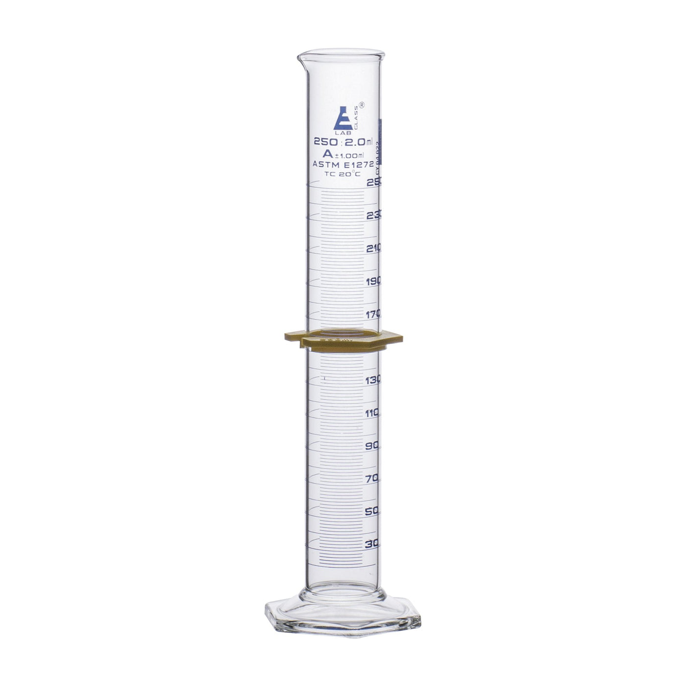 Graduated Cylinders - Glass , Class -A 250ml ASTM with Hexagonal Base , Guard & individual work certificate, Blue Line of Demarcation, Each