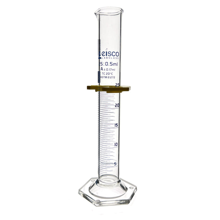 Here is the corrected text: This 25mL capacity measuring cylinder is made of high-quality, heavy-duty borosilicate 3.3 glass. It features a hexagonal base for extra stability and meets Class A tolerance with an accuracy of ±0.17mL as per ISO/ASTM standards. Fitted with a plastic, hexagonal bumper guard, it prevents breaking or chipping. The cylinder stands 6.88" tall, with a base measuring 2.06" wide. The inner diameter of the cylinder body measures 0.73", and the outer diameter measures 0.87". Autoclavable and offering superior chemical durability, this cylinder has a low temperature gradient, allowing it to withstand high temperatures and thermal shocks. Eisco Labs' borosilicate glass has the following heat tolerances: Strain Point 515°C, Annealing Point 565°C, and Softening Point 820°C. Eisco Labs proudly manufactures its own products using state-of-the-art equipment and follows the highest standards of quality control. Each product is carefully designed by a team of laboratory professionals and experienced engineers with quality and durability in mind. They are manufactured using only the highest-grade raw materials and according to international quality standards, ensuring they can withstand use in even the toughest laboratory environments.
