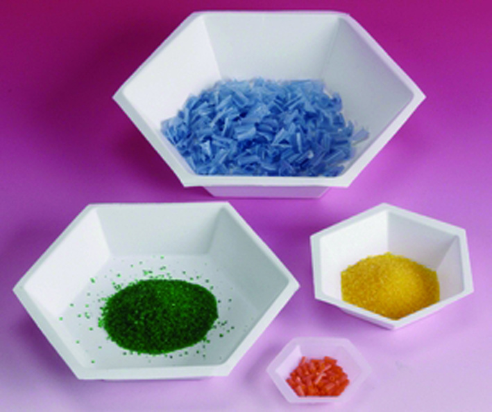 Here is the corrected text: These polystyrene weighing boats feature smooth surfaces that enable accurate pour-out with minimal sample loss. They are biologically inert and resistant to dilute and weak acids, aqueous solutions, alcohols, and bases. The flexible, antistatic boats bend at points to form pouring spouts. Features: • Flat bottom avoids tipping • Sloping sides provide accurate transfer • Antistatic • Temperature resistant up to 70°C (158°F) Available sizes: * Small: Cat. No. 10770-452, Top I.D.: 38 mm (1½"), Base I.D.: 25 mm (1") * Medium: Cat. No. 10770-454, Top I.D.: 64 mm (2½"), Base I.D.: 51 mm (2") * Large: Cat. No. 10770-456, Top I.D.: 102 mm (4"), Base I.D.: 76 mm (3") * X-Large: Cat. No. 10770-458, Top I.D.: 127 mm (5"), Base I.D.: 89 mm (3½")