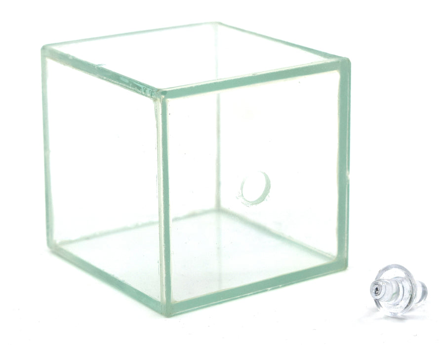 Hollow glass cube, made from glass plates properly cemented. Size 50 x 50 x 50 mm Cube. Stopper included. Excellent tool for optical experimentation, as well as for studying Snells Law of Refraction. Change the liquids or gases in the cube to change the refraction properties.