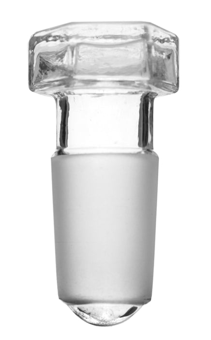 Hollow stopper made of high quality, 3.3 borosilicate glass. Stopper features a hexagonal shape top and a round End. 19/26 cone size. Stopper measures 2" long, and top measures 1" wide.