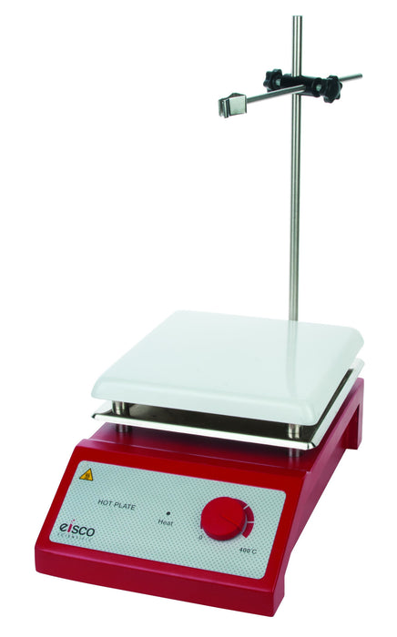EISCO introduces a range of stylish and economical range of hot plates and stirrers for general laboratory use. The plate is ceramic coated aluminum which allows excellent chemical resistance. These are equipped with powerful heating elements providing very quick heating of the samples. • Plate Material: Ceramic coated Metal • Plate Dimensions: 190 x 190 mm • Heater Power: 650 W • Max. Plate Temperature: 400 degrees • Control: Analogue • Accessories: Rod and clamp holder • Dimensions: 33 x 19.5 x 13 cm • Weight: 4 kg • Input 110/120 V AC, 60 Hz