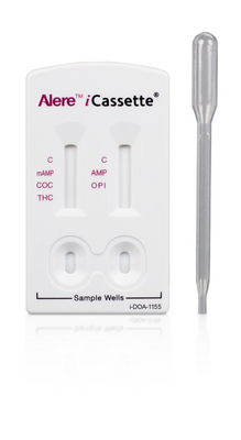 iCassette Tests^ For 5 drugs in a simple cassette/pipette format. COC,THC, OPI, AMP,Mamp. CLIA WAIVED.