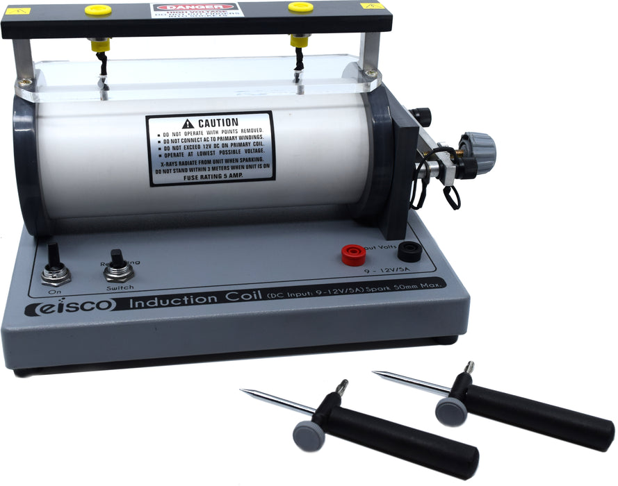 The induction coil provides extremely high voltages, typically in the tens of thousands of volts, from a DC source. The operating principle is based on a step-up transformer consisting of a primary winding with a few tens of turns and a secondary winding with hundreds of thousands of turns. To produce permanent sparks, it is necessary to interrupt the current flowing through the primary winding using an electromagnetic bell, also known as a shaker. The induction coil stands 6 inches tall, 11.5 inches wide, and 7 inches long. Each spark rod measures 5.25 inches long and 2.25 inches wide.