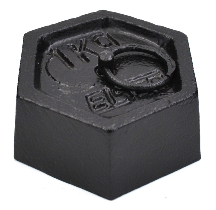 Eisco's 1000g (2.2lb) hexagonal iron masses, weighing 1000 grams (2.2 pounds), feature a solid iron construction with a black paint finish. They come equipped with a lifting ring, enabling easy mobility and secure hanging. Measuring 3.5 x 3 x 1.25 inches, these masses are manufactured within international tolerance standards, making them ideal for balancing scale applications in the classroom, where they facilitate safer and easier transportation while allowing for activities that require suspension.