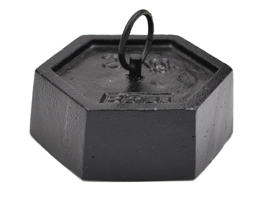 Eisco's 2000g (4.4lb) Hexagonal Iron Mass is a solid iron weight, painted black, with a lifting ring for easy mobility and hanging. It measures 4.5 x 3.9 x 1.6 inches and meets international tolerance standards, making it ideal for balancing scale applications in the classroom.