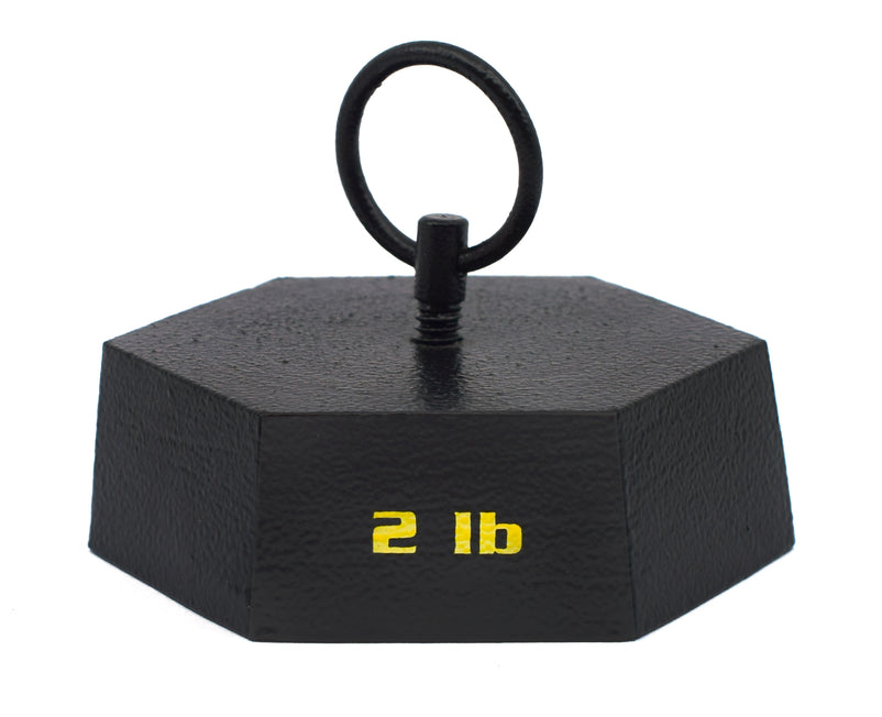 Single mass weighing 2 pounds (907.185 grams) Hexagonal shape Features ring for easy lifting Measures 3" long, 3.2" wide & 1" tall Made of cast iro