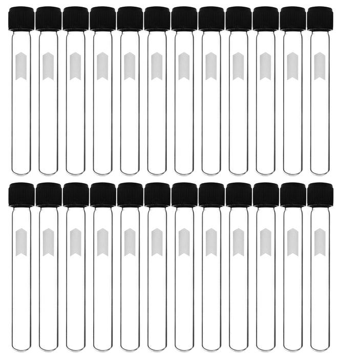 Pack of 24 round-bottom culture tubes, each with a 5mL capacity. Made from high-quality Borosilicate 3.3 glass, the tubes include a Bakelite screw cap with a rubber liner for a leak-proof seal. Each tube features a small, 0.6" x 0.3" writable area for easy labeling. These tubes are useful for various laboratory applications, including transferring and storing chemicals and samples, as well as handling and culturing biological materials. They are also suitable for use in homes or garages for crafting and storage. The culture tubes are autoclavable and feature superior chemical durability, with a low temperature gradient that allows them to withstand high temperatures and thermal shocks. Each culture tube measures 0.5" wide and 3.9" tall (including cap). Designed for use in professional laboratories, they are an ideal choice for science classrooms and household use.