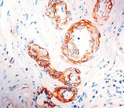 Laminin^ Clone number 4C7, This antibody reacts with the terminal globular domain of the A chain. It does not cross react with laminin from mouse or rat. The staining with this antibody is sensitive to fixation of paraffin tissues and use of proteolytic enzymatic treatment.