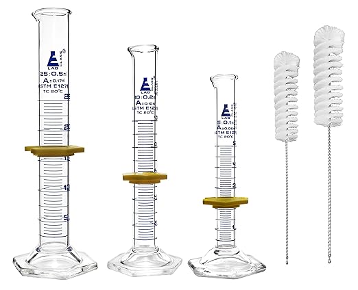 Industrial-quality set of three measuring cylinders made from high-quality, heavy-duty Borosilicate 3.3 glass. The set includes cylinders with 5ml, 10ml, and 25ml capacities and comes with two bristle brushes for easy cleaning. ASTM E1272 compliant, meeting Class A tolerance standards as per ISO/ASTM regulations. The measuring cylinders feature easy-to-read blue printed graduations and specifications, calibrated to contain. The cylinder's hexagonal base ensures maximum stability and is fitted with a removable plastic protective collar. This product is great for professional laboratories, classrooms, and household use, offering superior chemical durability and heat tolerance. Designed for use in professional laboratories, it is also an ideal choice for science classrooms and household applications.