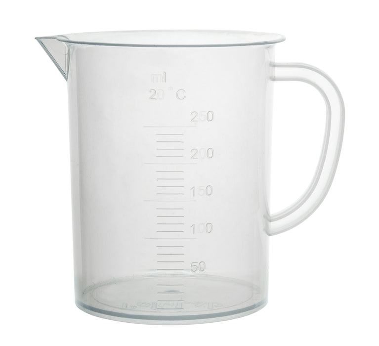 250ml capacity measuring jug made of high-quality polypropylene plastic. The jug features excellent optical clarity and easy-to-read, raised graduations and specifications with 10ml subdivisions. It has a spout for easy pouring and a handle for stable handling and convenient lifting. The jug measures 3.8" in height and is 4.4" wide from the spout to the handle edge, with a bottom diameter of 2.7".