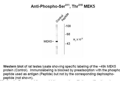 MEK5 (phospho Ser311/Thr315) Antibody^ Polyclonal, Host: Rabbit; Species Reactivity: Human, Mouse, Rat, Canine, Zebrafish, Bovine, Chicken, Frog; Immunogen: Phosphopeptide corresponding to amino acid residues surrounding the phospho-Ser311, Thr315 of MEK5; Tested Applications: WB